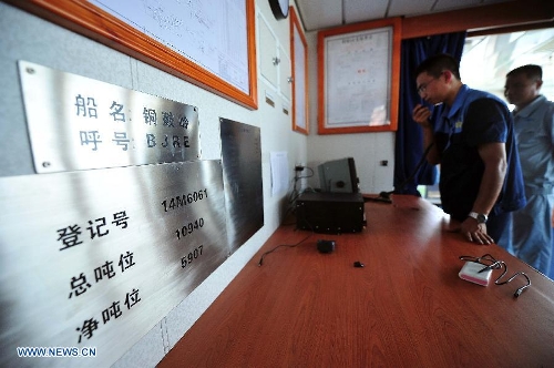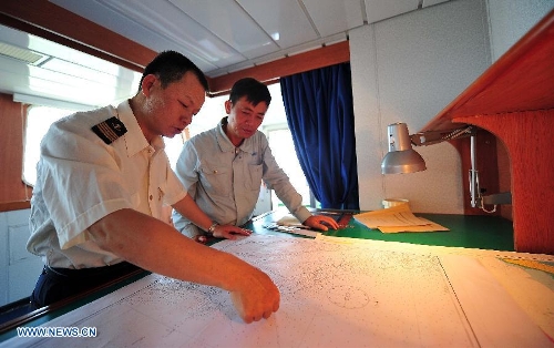 Captain Lin Shaohui (L) and First Mate Zhuo Shu work aboard China's passenger ship "Tongguling" on May 18, 2014. "Tongguling" left for Vietnam from Xiuying port in Haikou, capital of south China's Hainan Province, on Sunday. China began on Sunday to send five ships to evacuate Chinese nationals caught in a deadly anti-China violence in Vietnam. "Wuzhishan" and "Tongguling" were the first two ships leaving for Vietnam. (Xinhua/Guo Cheng)