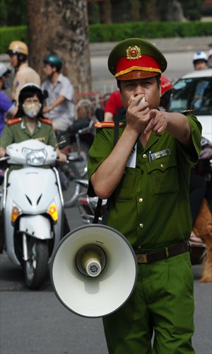 A policeman asks people to leave a street near the Chinese Embassy in Hanoi on Sunday. A call for further anti-China protests appeared to have fizzled out in the capital, with authorities deploying heavy security around the Chinese Embassy and other suspected protest sites. Photo: AFP