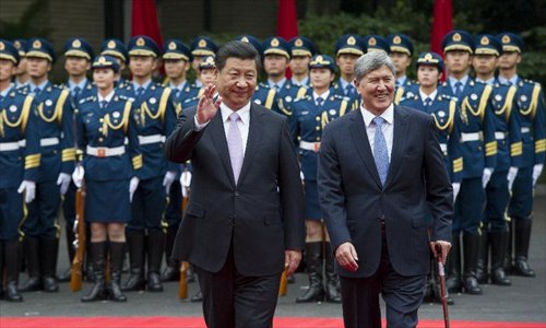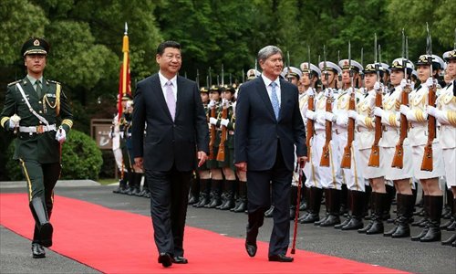 Chinese President Xi Jinping (L) holds a welcoming ceremony for visiting Kyrgyz President Almazbek Atambaev before their talks in Shanghai, east China, May 18, 2014.Photo: Xinhua