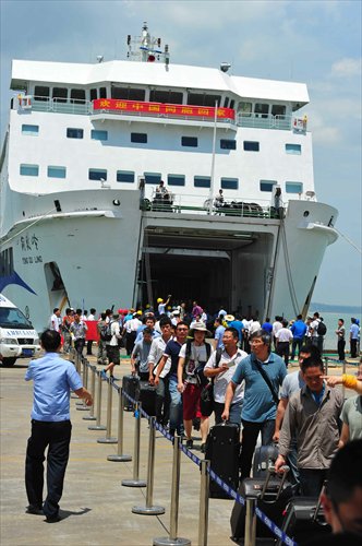 Evacuated Chinese workers disembark at Xiuying Harbor in Haikou, Hainan Province on Tuesday. Photo: CFP