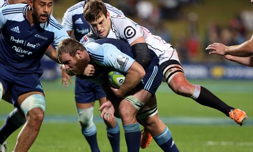 Coastal Sharks' Keegan Daniel (top) tackles Auckland Blues' Luke Braid (center) during their Super 15 rugby union match at Albany Stadium in Auckland on Friday. The Sharks ground out a 29-23 win. Photo: AFP
