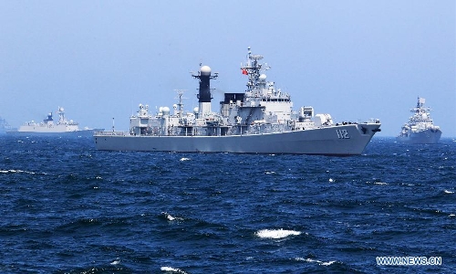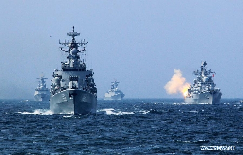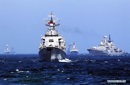 Chinese and Russian vessels gather at designated sea area during the China-Russia joint naval drill on East China Sea, May 24, 2014. The three-day drill "Joint Sea-2014" ended successfully on Saturday. The Chinese and Russian navies staged exercises, including joint escort drill, joint aircraft identification exercise and air defense and maritime assault drills. (Xinhua/Zha Chunming)