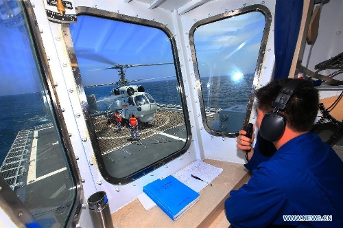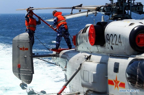 Chinese Navy soldiers work on a helicopter before sending it into hangar on China's Zhengzhou missile destroyer during the China-Russia joint naval drill on East China Sea, May 24, 2014. The three-day drill "Joint Sea-2014" ended successfully on Saturday. The Chinese and Russian navies staged exercises, including joint escort drill, joint aircraft identification exercise and air defense and maritime assault drills. (Xinhua/Zha Chunming)