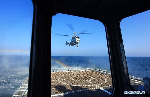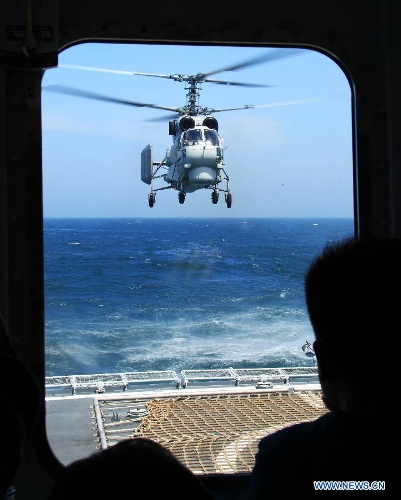 A navy helicopter returns to China's Zhengzhou missile destroyer during the China-Russia joint naval drill on East China Sea, May 24, 2014. The three-day drill "Joint Sea-2014" ended successfully on Saturday. The Chinese and Russian navies staged exercises, including joint escort drill, joint aircraft identification exercise and air defense and maritime assault drills. (Xinhua/Zha Chunming)