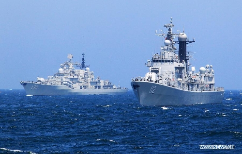 China's Ningbo missile destroyer (L) and Harbin missile destroyer (R) gather at designated sea area during the China-Russia joint naval drill on East China Sea, May 24, 2014. The three-day drill "Joint Sea-2014" ended successfully on Saturday. The Chinese and Russian navies staged exercises, including joint escort drill, joint aircraft identification exercise and air defense and maritime assault drills. (Xinhua/Zha Chunming)