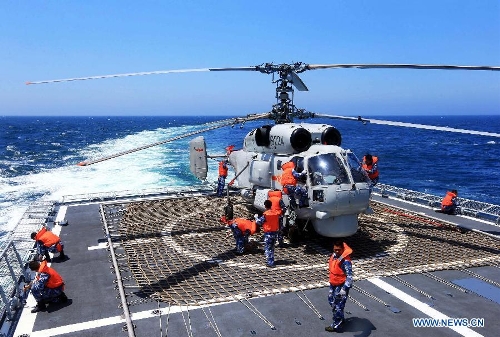 Chinese navy soldiers work on a helicopter before sending it into hangar on China's Zhengzhou missile destroyer during the China-Russia joint naval drill on East China Sea, May 24, 2014. The three-day drill "Joint Sea-2014" ended successfully on Saturday. The Chinese and Russian navies staged exercises, including joint escort drill, joint aircraft identification exercise and air defense and maritime assault drills. (Xinhua/Zha Chunming)