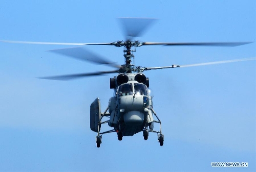 A Chinese navy helicopter takes off from China's Zhengzhou missile destroyer during the China-Russia joint naval drill on East China Sea, May 24, 2014. The three-day drill "Joint Sea-2014" ended successfully on Saturday. The Chinese and Russian navies staged exercises, including joint escort drill, joint aircraft identification exercise and air defense and maritime assault drills. (Xinhua/Zha Chunming)