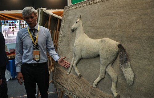 A merchant from Turkmenistan introduces a piece of wool tapestry at the 18th Investment & Trade Forum between East & West China in Xi’an, Shaanxi Province on May 23, 2014. Turkmenistan is celebrated for its wool tapestries. Photo: Liu Sha/GT