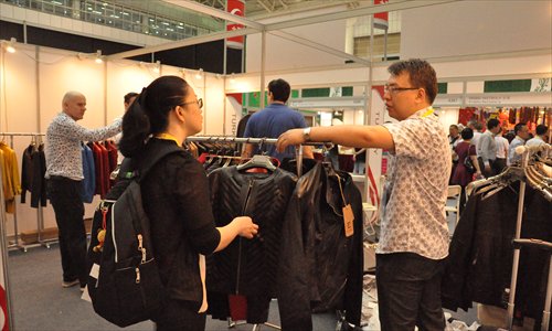 An employee at the Turkey pavilion shows leather jackets to a customer at the 18th Investment & Trade Forum between East & West China in Xi’an, Shaanxi Province on May 23, 2014. Photo: Liu Sha/GT
