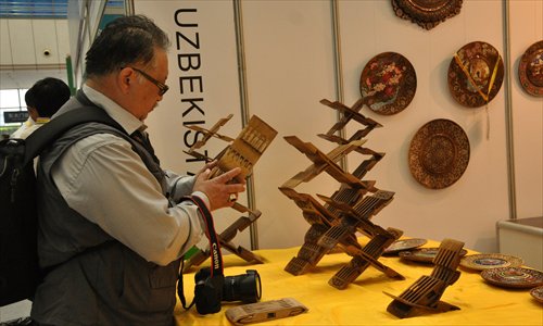 A visitor examines a handicraft at the Uzbekistan pavilion at the 18th Investment & Trade Forum between East & West China in Xi’an, Shaanxi Province on May 23, 2014. Photo: Liu Sha/GT