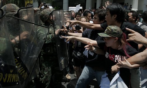 Thai soldiers scuffle with anti coup protesters during a planned gathering in Bangkok on Sunday. Thailand's military junta said it had disbanded the Senate and placed all law-making authority in the hands of the army chief. Photo: AFP