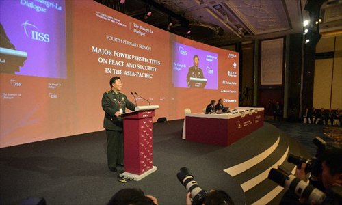 Wang Guanzhong, deputy chief of the General Staff of the Chinese People's Liberation Army, speaks during the fourth plenary session of the 13th Shangri-La Dialogue in Singapore June 1, 2014, the final day of the multilateral forum focusing on security issues in Asia. Photo:Xinhua