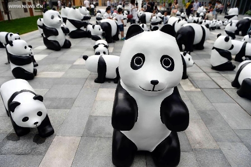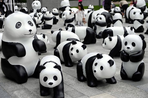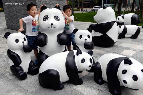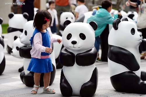 Lovely "pandas" are seen during the "1St panda" exhibition at Kerry Center Square in Shanghai, east China, June 2, 2014. A total of 100 pandas made of leftover moso bamboos were displayed during the exhibition. (Xinhua/Lai Xinlin)