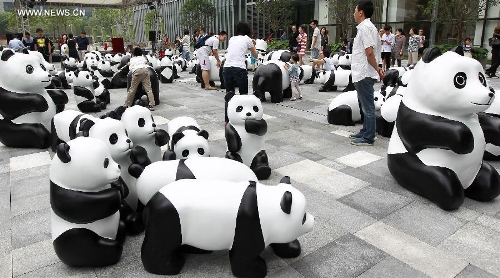 Lovely "pandas" are seen during "1St panda" exhibition at Kerry Center Square in Shanghai, east China, June 2, 2014. A total of 100 pandas made of leftover moso bamboos were displayed during the exhibition. (Xinhua/Lai Xinlin)