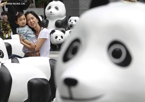 A parent and her child pose for photos with lovely "pandas" during the "1St panda" exhibition at Kerry Center Square in Shanghai, east China, June 2, 2014. A total of 100 pandas made of leftover moso bamboos were displayed during the exhibition. (Xinhua/Ding Ting)