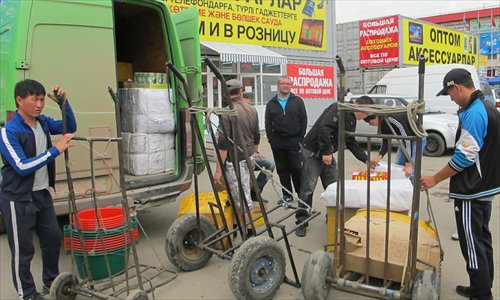 Workers unload goods imported from China at the Yalian Trade Center in Almaty, Kazakhstan. Photo: Wang Wenwen/GT
