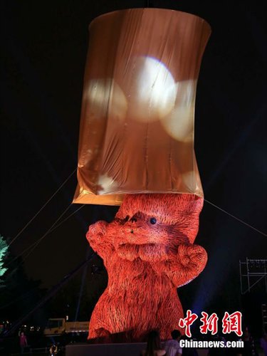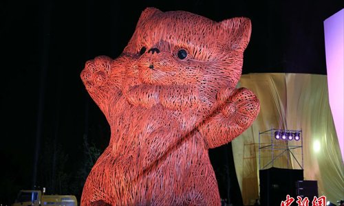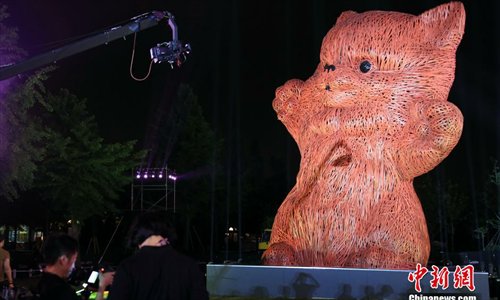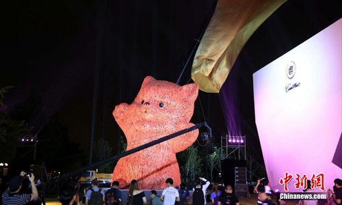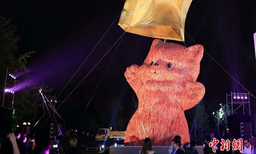 A large pink cat, designed by Dutch artist Florentijn Hofman, is displayed in Shanghai on May 30, 2014. The nearly 10-meter tall cat made of bamboo debuted in Shanghai as part of an art and design expo in the city’s Century Park. The artist behind the large Rubber Duck that floated its way into China’s port cities was inspired by the stray cats in Shanghai’s parks. Photo: Chinanews.com