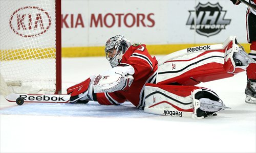 Corey Crawford of the Chicago Blackhawks gives up a goal to Justin Williams of the Los Angeles Kings in Chicago on Sunday (US time). Photo: AFP