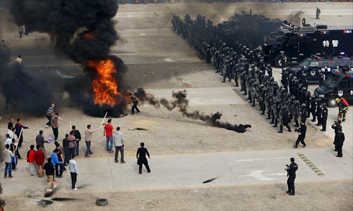 Police officers holding shields and batons line up to control other participants pretending to be an angry mob during an anti-terrorism drill in Beijing on Friday. Photo: IC