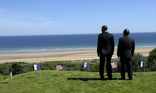 US President Barack Obama and French President Francois Hollande look out over Omaha Beach during a joint French-US D-Day commemoration ceremony at the Normandy American Cemetery and Memorial in Colleville-sur-mer, on Friday, marking the 70th anniversary of the World War II Allied landings. Photo: AFP