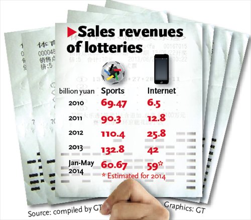 Domestic sales of sports lotteries hit 132.8 billion yuan in 2013, an increase of 20.2 percent year-on-year, and sales in the first five months ending May 2014 stood at 60.67 billion yuan, data from the