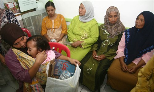 An Indonesian member of Klinik Bumi Ayu holds her child, seen at left, and a bag of recyclable garbage, while she waits along with others at a clinic in Malang in Java on April 26. Photo: AFP
