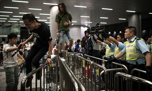 Demonstrators protesting against a land project stand on barriers as policemen stand guard at of the Legislative Council in Hong Kong on June 14. Many fear this protest that turned violent could be a prelude to the Occupy Central movement. Photo: AFP