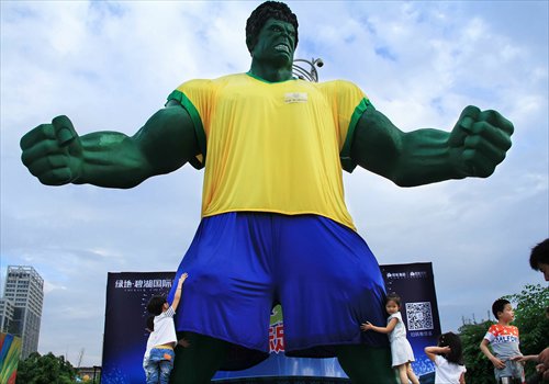 Children visit a statue of The Hulk dressed to resemble Brazilian football star Pelé in Ningbo, Zhejiang Province. Photo: CFP
