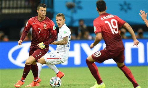 Portugal's Cristiano Ronaldo (L) runs with the ball during a Group G match between U.S. and Portugal of 2014 FIFA World Cup at the Arena Amazonia Stadium in Manaus, Brazil, June 22, 2014.Photo: Xinhua
