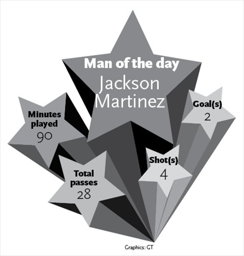 Colombia's forward Jackson Martinez (right) vies with Japan's defender Atsuto Uchida at the Pantanal Arena in Cuiaba during the 2014 FIFA World Cup in Brazil on Tuesday. Photo: AFP