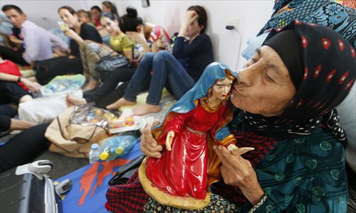 An Iraqi Christian woman fleeing violence kisses the head of a statue representing a Christian saint at a community center in the Kurdish city of Arbil in Iraq's autonomous Kurdistan region on Friday. Photo: AFP