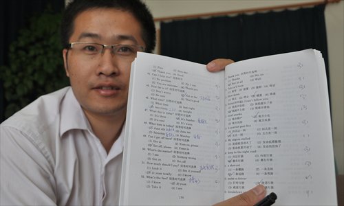 Driver Pu Yongping shows the materials he used to prepare for the advanced five-star taxi exam. Photo: Huang Lanlan/GT