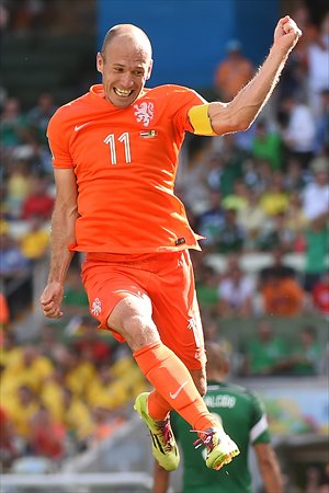 Netherlands' Arjen Robben celebrates their victory at the end of a Round of 16 match against Mexico in Fortaleza, Brazil during the 2014 FIFA World Cup on Sunday (Brazilian time). Photo: AFP