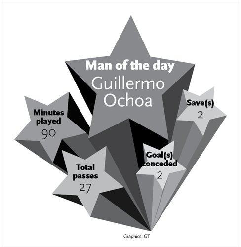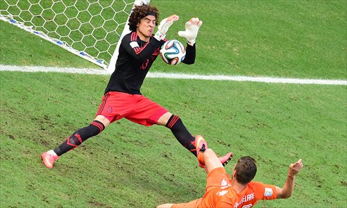 Mexico goalkeeper Guillermo Ochoa (left) makes a save on a shot by Netherlands forward Klaas-Jan Huntelaar during a Round of 16 match in Fortaleza during the 2014 FIFA World Cup on Sunday (Brazilian time). Photo: AFP