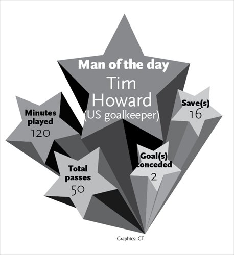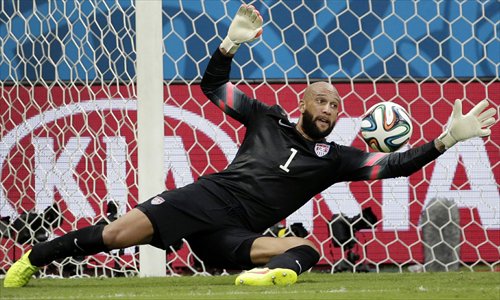 US goalkeeper Tim Howard saves a shot by Belgium in a Round of 16 match in Salvador, Brazil during the FIFA World Cup on Tuesday (Brazilian time). Photo: IC