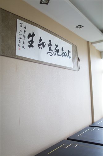 Jia was then led to another room, which contained a line of black coffins. A scroll on the wall read "If you don't know death, how will you know life?" (pictured above) Jia stepped into one of the coffins and sat down. The room was permeated with a sad melody. Jia was given 15 minutes to write down her "last words" on a piece of paper.