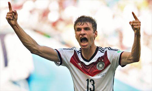 Germany's Thomas Mueller celebrates scoring against Portugal in a group-stage match during the World Cup in Salvador on June 16. Photo: IC