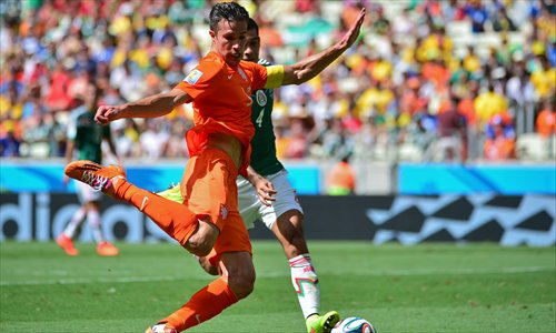 Netherlands' Robin van Persie shoots against Mexico in a Round of 16 match in Fortaleza during the World Cup on Sunday. Photo: AFP