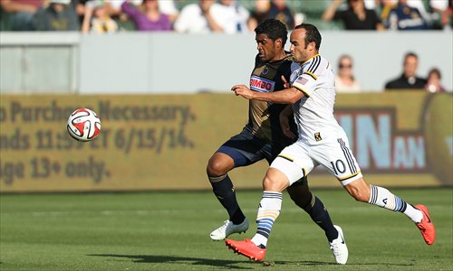 Landon Donovan (No.10) of the Los Angeles Galaxy competes for the ball with Sheanon Williams of the Philadelphia Union during their Major League Soccer match in Los Angeles on May 25. Photo: CFP