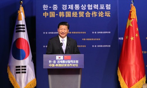 Chinese President Xi Jinping speaks at a forum on China-South Korea economic and trade cooperation in Seoul, capital of South Korea, July 4, 2014. Xi Jinping and his South Korean counterpart Park Geun-hye attended the forum jointly on Friday.Photo: Xinhua