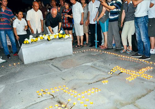 Over 100 local residents and witnesses of the "July 7 Incident," or the start of the War of Resistance Against Japanese Aggression, meet at the Marco Polo Bridge (Lugou Bridge) in southwest Beijing on July 6, 2014, to commemorate the 77th anniversary of China's fight against Japanese occupation. Those in attendance brought flowers and lit candles to honor those that died in the conflict. Photo: People's Daily