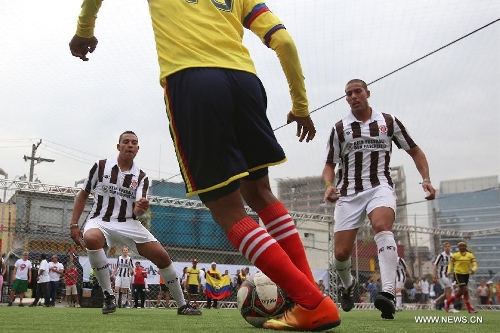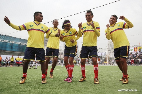 Athletes of Colombia celebrate after scoring against Germany during Street Football World Cup in Sao Paulo, Brazil, on July 7, 2014. This sports event attracted around 300 youngsters from 20 countries and regions all over the world. Differing from the conventional football match, the Street Football World Cup allowed athletes of different sexes to play together and there are no arbitrators. (Xinhua/Rahel Patrasso)
