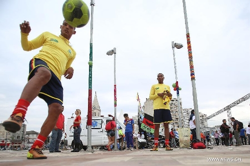 An athlete of Colombia controls the ball during the Street Football World Cup in Sao Paulo, Brazil, on July 7, 2014. This sports event attracted around 300 youngsters from 20 countries and regions all over the world. Differing from the conventional football match, the Street Football World Cup allowed athletes of different sexes to play together and there are no arbitrators. (Xinhua/Rahel Patrasso)