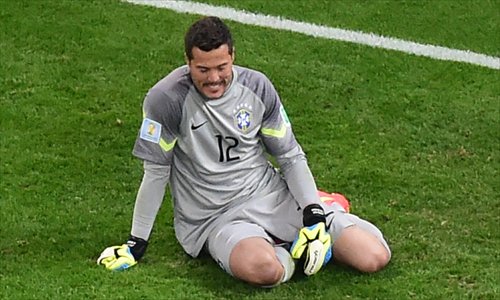 Brazil's goalkeeper Julio Cesar reacts after Germany scored their sixth goal during the World Cup semifinal in Belo Horizonte on Tuesday (Brazilian time). Photo: AFP