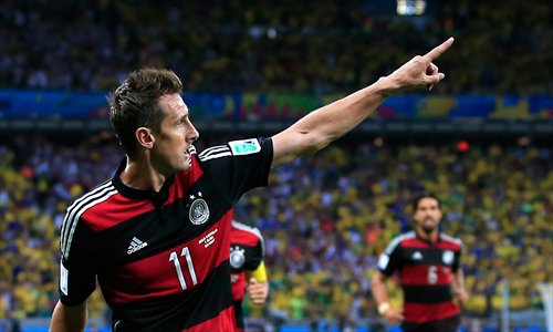 Germany's forward Miroslav Klose celebrates after scoring during the semifinal match against Brazil at the Mineirao Stadium in Belo Horizonte on Tuesday (Brazilian time). Klose is now the World Cup all-time record scorer with 16 goals, eclipsing former Brazilian star striker Ronaldo. Photo: AFP
