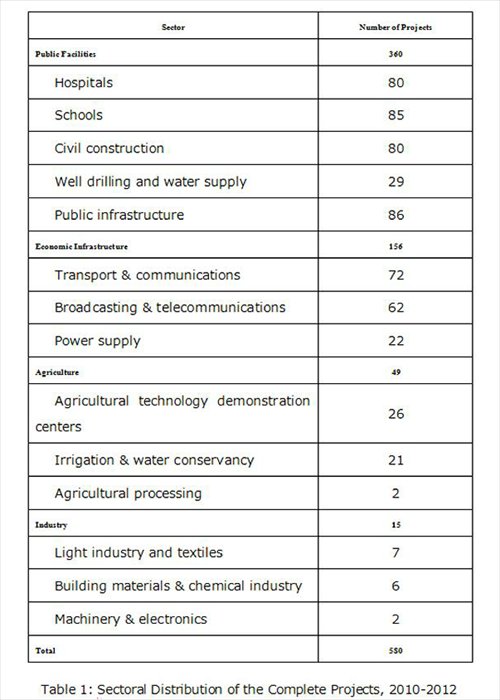 From 2010 to 2012, China provided foreign assistance mainly in the following forms: undertaking complete projects, providing goods and materials, conducting technical cooperation and human resources development cooperation, dispatching medical teams and volunteers, offering emergency humanitarian aid, and reducing or exempting the debts of the recipient countries.