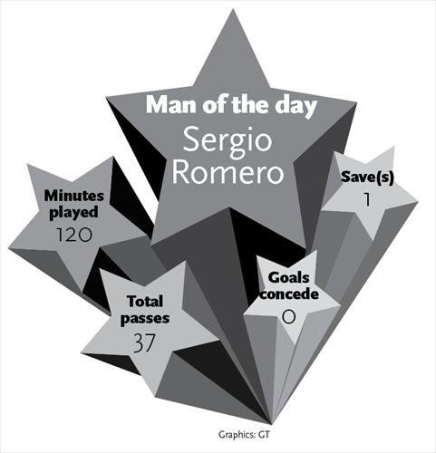 Argentina's goalkeeper Sergio Romero reacts after saving a penalty during the penalty shootout during the semifinal match against the Netherlands at the Corinthians Arena in Sao Paulo on Wednesday. Photo: AFP