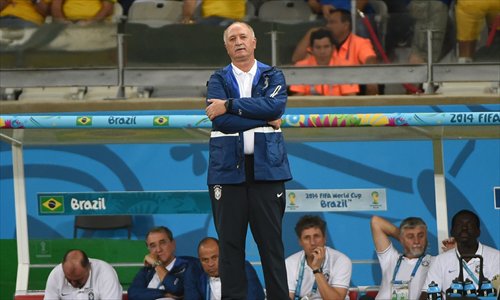 Brazil's coach Luiz Felipe Scolari reacts during the semifinal match against Germany in Belo Horizonte, Brazil during the 2014 FIFA World Cup on Tuesday. Photo: AFP