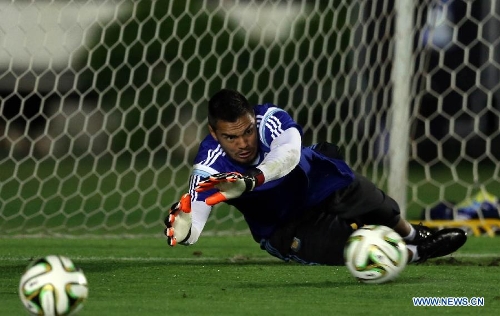 Goalkeeper Sergio Romero of Argentina's national soccer team takes part in a training session in Rio de Janeiro, Brazil, on July 12, 2014. Germany will face Argentina in the final match of the 2014 FIFA World Cup Brazil, on July 13. (Xinhua/TELAM)