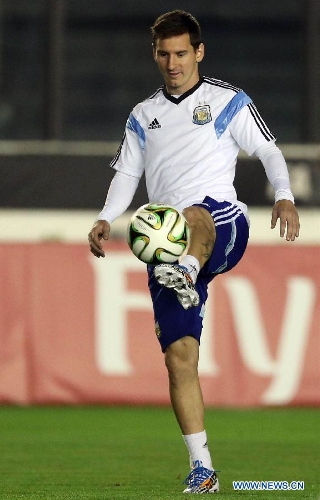 Lionel Messi of Argentina's national soccer team takes part in a training session in Rio de Janeiro, Brazil, on July 12, 2014. Germany will face Argentina in the final match of the 2014 FIFA World Cup Brazil, on July 13. (Xinhua/TELAM)